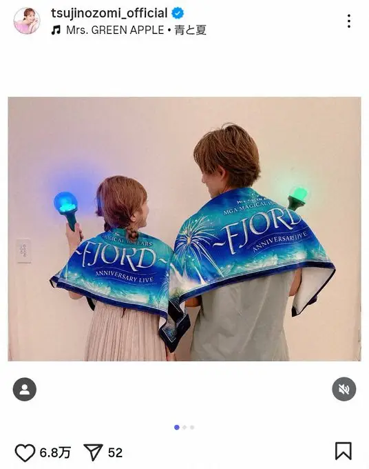 「今日は @mgaband さんのLIVEに行って来ました」と書き出して、26日と27日に神奈川県・横浜の山下ふ頭にて開催された、「Mrs. GREEN APPLE」の10周年を記念するイベント「MGA MAGICAL 10 YEARS ANNIVERSARY LIVE」へ行ったことを報告。夫・杉浦太陽とイベントグッズを身につけた2ショットを公開した。