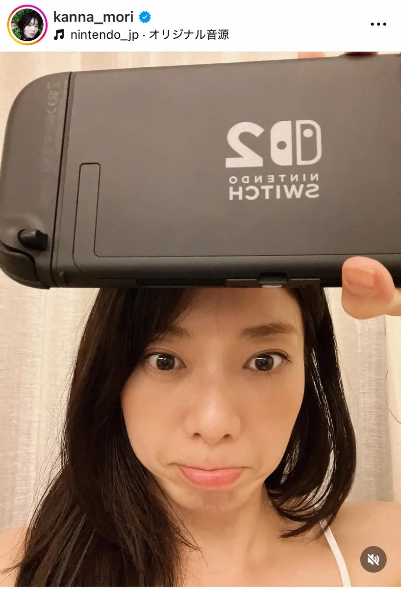 任天堂の新型ゲーム機「Nintendo Switch2」を掲げ、肩周りがあらわになった涼しげな装いの自撮りショットを添えて、「了解!!!ずーーーっと家いるね!!!」とつづった。