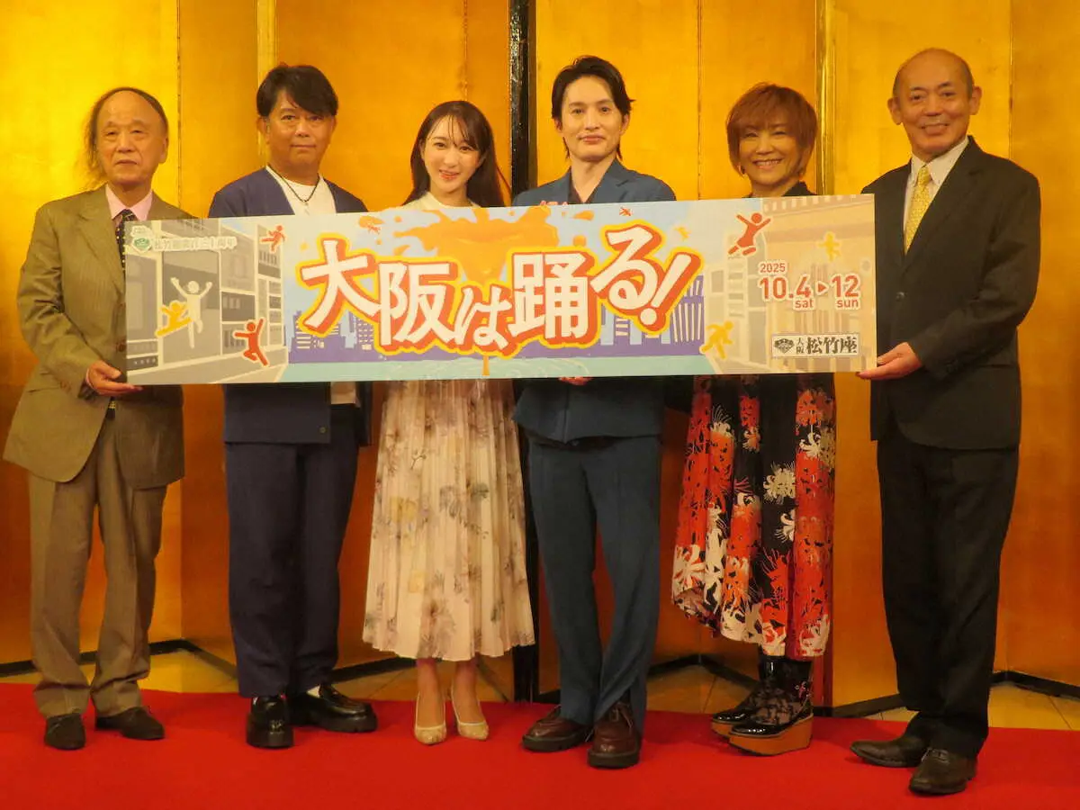 舞台「大阪は踊る!」の取材会で意気込みを語った(左から)海原はるか、前田耕陽、有沙瞳、浜中文一、松本梨香、曽我廼家寛太郎