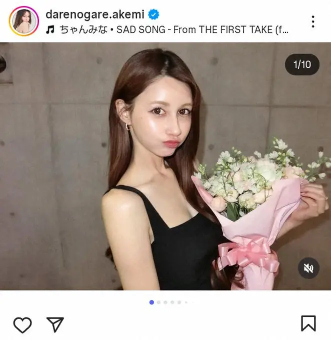 シンプルな黒いノースリーブトップスに、白い腕が生えるスタイル。華やかな花束を抱えてカメラ目線で写真に収まった。