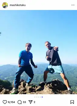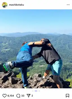 コンビのYouTubeチャンネルで登山企画に挑戦している益子。この日は「福島の霊山(りょうぜん)で大一番!!絶景でした」と書き出すと、福田と崖で相撲を取る写真を投稿した。