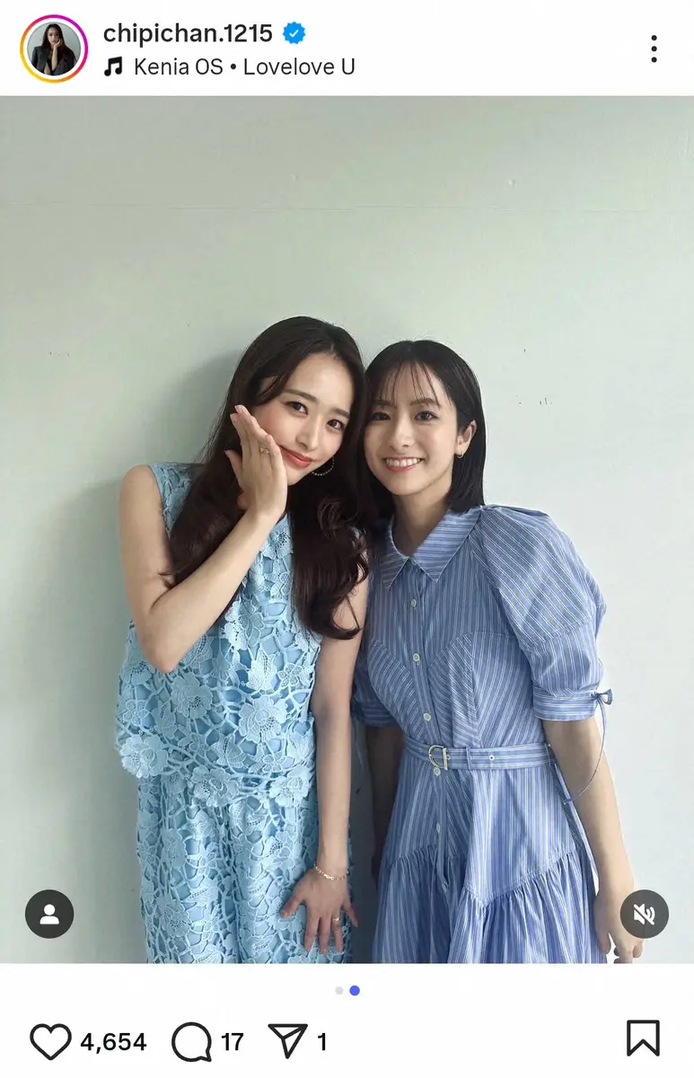 「なんと!!8/27にまこちんのフォトエッセイ『陽がのぼるほうへ』が発売になります パチパチ その中で私も対談させていただきました 素過ぎるふたりの会話が載っています。笑 私も早くゲットしたいー」とつづり、「ラヴィット!」で共演中のTBS・田村真子アナウンサー(29)とのブルーコーデが映える“仲良し2ショット”を披露。