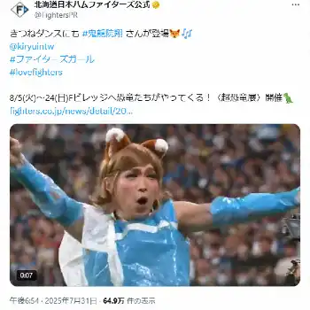 北海道日本ハムファイターズ公式(@FightersPR)から 「誰かと思った!」「女装かわいい」 金爆・鬼龍院翔のコスプレきつねダ… ギャラリーで見る この記事のフォト 2025年07月31日の画像一覧 もっと見る 2025年07月31日の画像をもっと見る