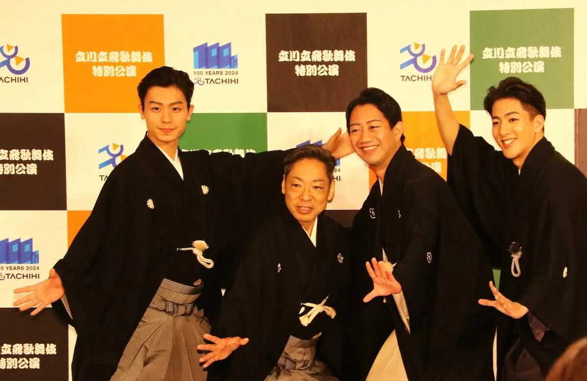 カメラに見得を切る(左から)市川團子、市川中車、中村壱太郎、市川右近