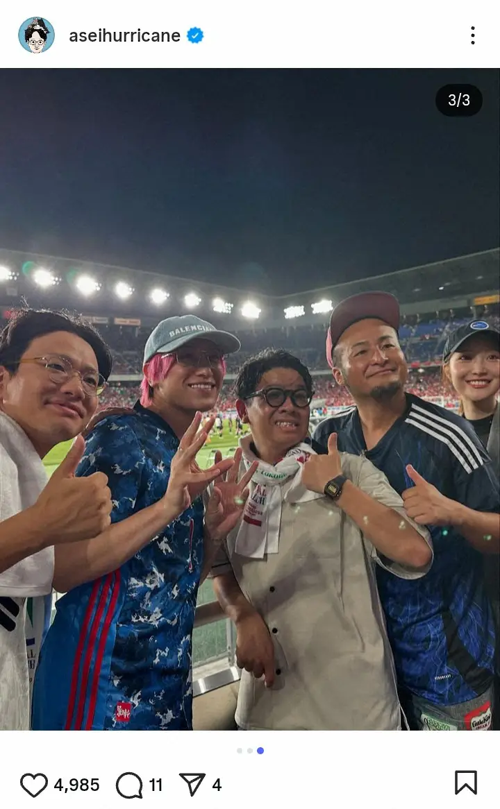 お笑いコンビ「ミキ」の亜生(37)が31日までに自身のインスタグラムを更新。人気お笑い芸人と30日に日産スタジアムで行われた横浜F・マリノスとイングランド・プレミアリーグのリバプールの親善試合を観戦したことを明かし、スタジアムでの思わぬ人物との遭遇ショットを投稿した。