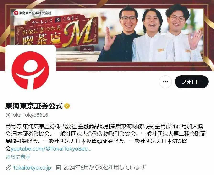 東海東京証券は31日、公式X(旧ツイッター)を更新。お笑いコンビ「令和ロマン」の高比良くるま(30)とお笑いコンビ「ヤーレンズ」が出演する公式YouTubeチャンネル「ヤーレンズ&くるまのお金にまつわる喫茶店M meets 東海東京証券」のシリーズ終了を発表した。