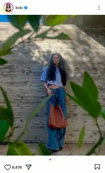 Koki,は英語で「Outfit of today Bag, boots and jewelry Merci beaucoup @louisvuitton 」とつづり、ミニ丈のブルーのストライプシャツにルーズ感たっぷりなデニムを合わせ、ブラウンのバックを手に持った夏の“ヘソ出しデニムコーデ”を披露。
