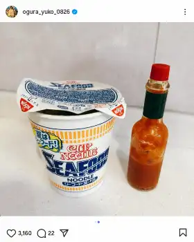 続けて「そして2枚目は笑」と、カップラーメンとタバスコの写真を公開。「昨夜は友人ファミリーと居酒屋さんへ行き、そこで話題になったのが『飲んだ後のシーフードヌードルにタバスコを入れると格別!』という話」と解説した。