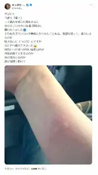 お笑いタレントのキンタロー。(43)が5日、自身のX(旧ツイッター)を更新。腕が赤く腫れた様子を投稿した。