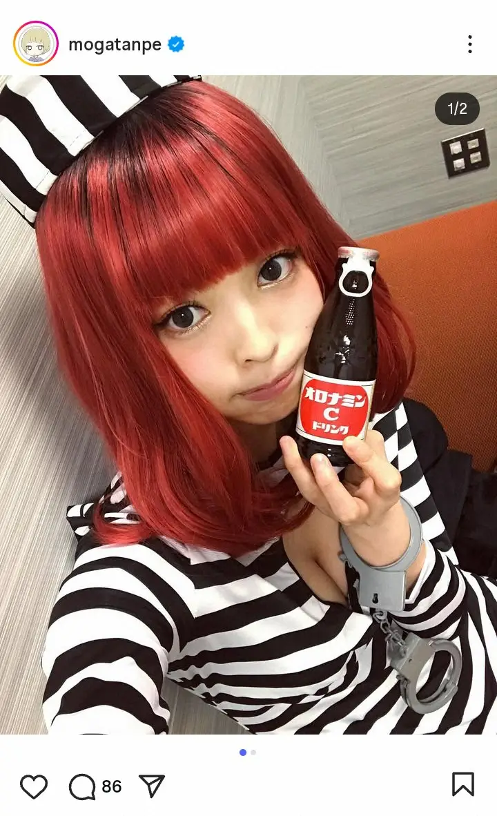「定期的にイメチェンしたい衝動に駆られてて」と書き出すと、赤のセミロングヘアで帽子をかぶり、手錠を手首に着けた、白と黒の囚人服のようなワンピース姿の自身のショットをアップ。