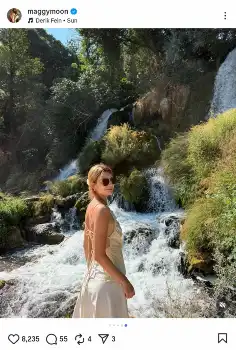 マギーは「こんな綺麗な滝と川、見たことない」と感激。「今年は背中見せるお洋服にハマってる!カナダから日焼けしてるからだいぶこんがりになってます」と、背中が大きく開いたトップスにスカートを合わせたファッションで、絶景を楽しむ様子を公開した。