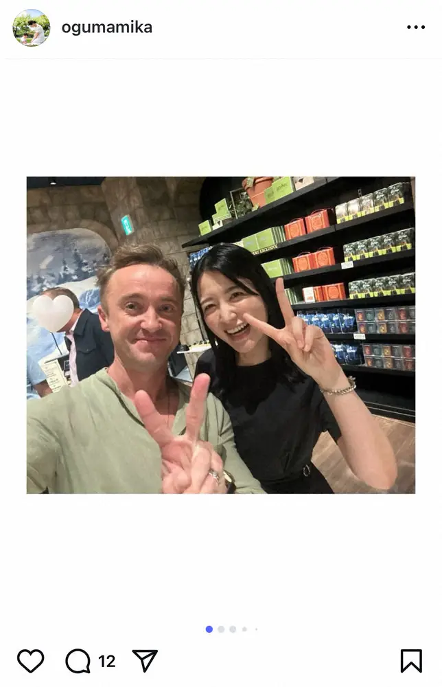 元日本テレビでフリーアナウンサーの小熊美香(39)が24日、自身のインスタグラムを更新。英俳優トム・フェルトン(37)との2ショットを公開した