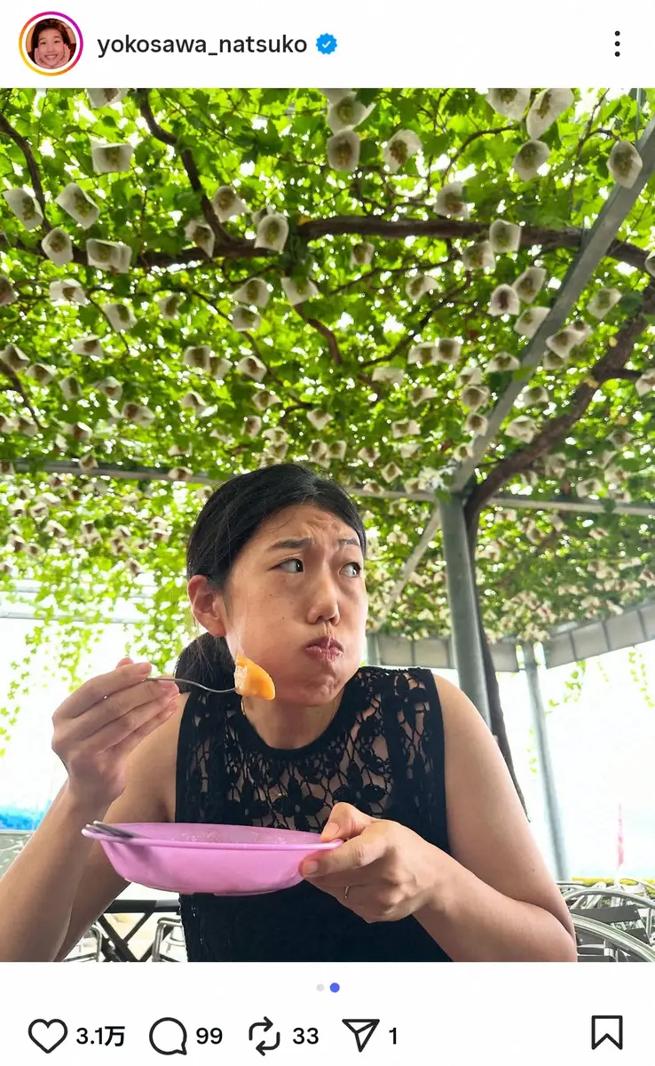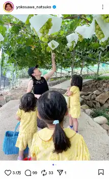 横澤は「夏ー!ぶどうー!大好きな桃ー!」とつづり、全員おそろいの黄色のセットアップに身を包んだ愛娘3人の後ろ姿を投稿し、奥には自身が一生懸命にぶどうを指さす様子の“ブドウ狩りショット”を披露。