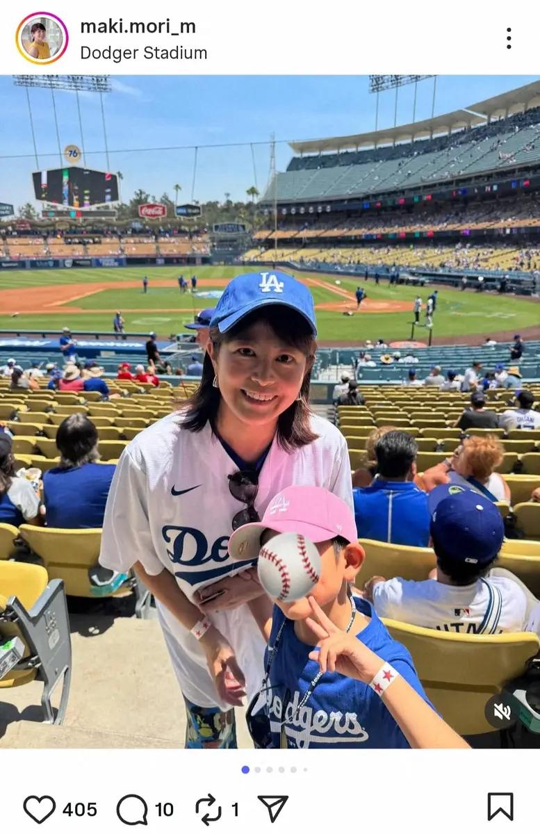 元日本テレビでフリーアナウンサーの森麻季(44)が、14日までに自身のインスタグラムを更新。長男と一緒にドジャー・スタジアムでドジャースの試合を観戦したことを報告した。