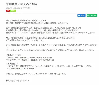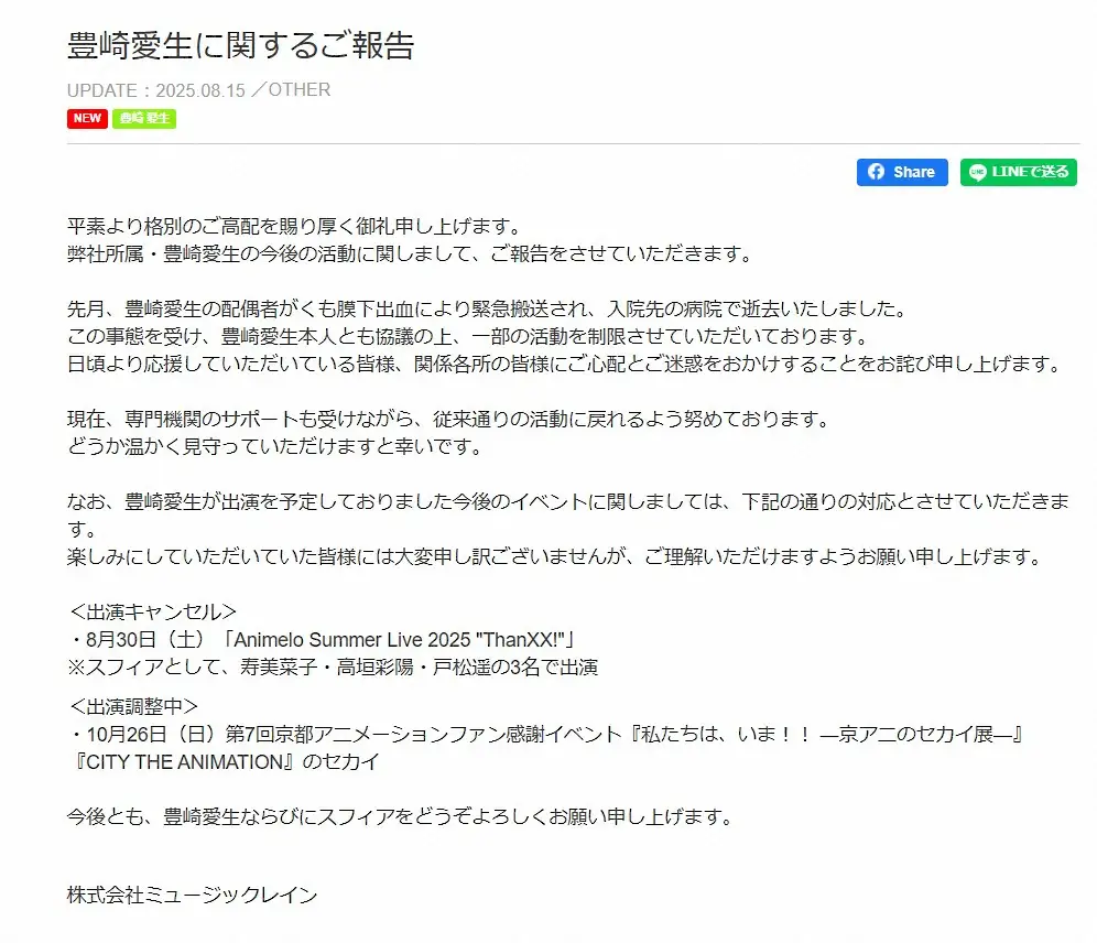 豊崎愛生(スフィアポータルスクエア公式サイトから) 「けいおん!」出演声優・豊崎愛生 配偶者がくも膜下出血で逝去…活動制限… ギャラリーで見る この記事のフォト 2025年08月15日の画像一覧 もっと見る 2025年08月15日の画像をもっと見る