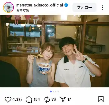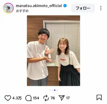 元乃木坂46でタレントの秋元真夏(31)が、14日までに自身のインスタグラムを更新。人気芸人との2ショットを披露した。