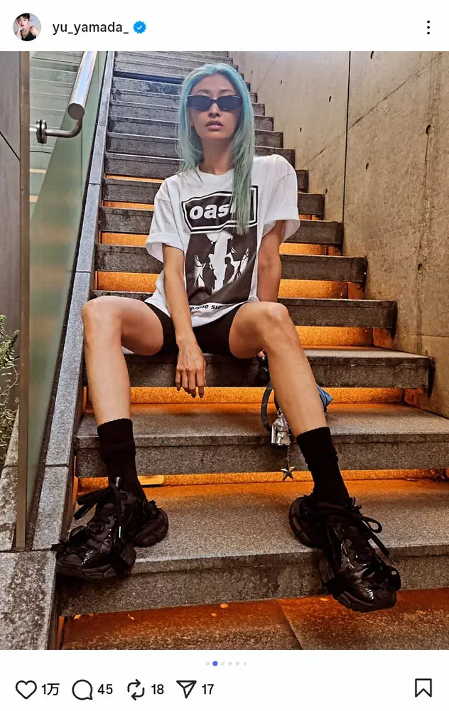 山田は「oasis待望の再結成を記念したリリース当時の貴重なシングルジャケットや アルバムブックレットのアートワークを落とし込んだスペシャルなTシャツが登場!!!!!」とコメント。「ぜひチェックしてみて」と、Tシャツにショートパンツを合わせてポーズを取った写真や、自転車に乗る姿を披露した。
