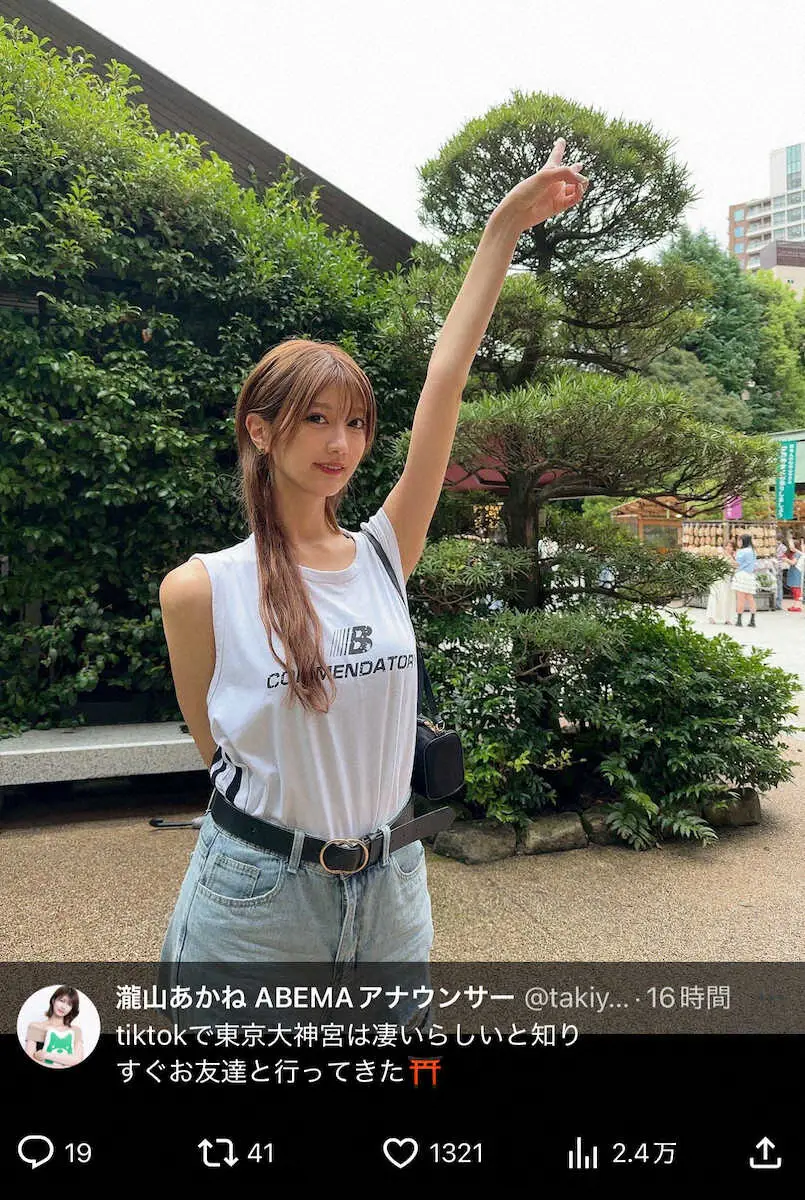 自身のX(旧ツイッター)で「tiktokで東京大神宮は凄いらしいと知りすぐお友達と行ってきた」と投稿。そして東京大神宮で撮影したノースリーブコーデ姿を公開した。