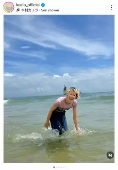 続いての投稿では釜山の市場を訪れた様子や、「足だけ海につけてお散歩してたけど、我慢できず服のまま海に入った」と着衣のまま腰まで海につかり笑顔のショットなどを公開。