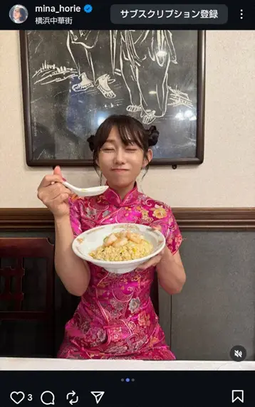 「一緒にチャーハン、食べチャイナよ!ん!ま!の顔」とつづり、ピンクのチャイナ服姿で海老チャーハンをほおばっているショットをアップした。