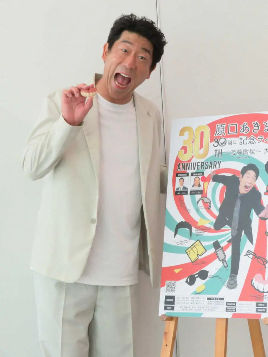 明石家さんまのモノマネで欠かせない「歯」を手に30周年記念ライブをアピールする原口あきまさ