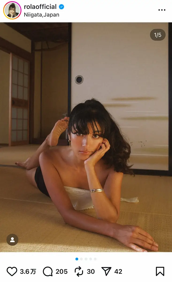 ローラは「The closer I get to nature, the closer I get to myself」とつづり、日焼けした肌を露出したファッションで、畳に寝そべる写真を複数枚投稿。