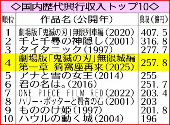 「鬼滅の刃」興行収入250億円突破 国内ランク4位浮上 歴代1位の前作上回るペース