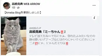 7月に自身のブログで、長年飼っていた愛犬が虹の橋を渡り、「思い出が多すぎて犬は飼えないね、、でも何か可愛い子がいるといいねぇと話していたところ、ずっと仲良くさせていただいてる、黒木瞳さんのお宅で、サイベリアンの赤ちゃんが産まれたと」聞き、一匹譲ってもらったと経緯を説明。