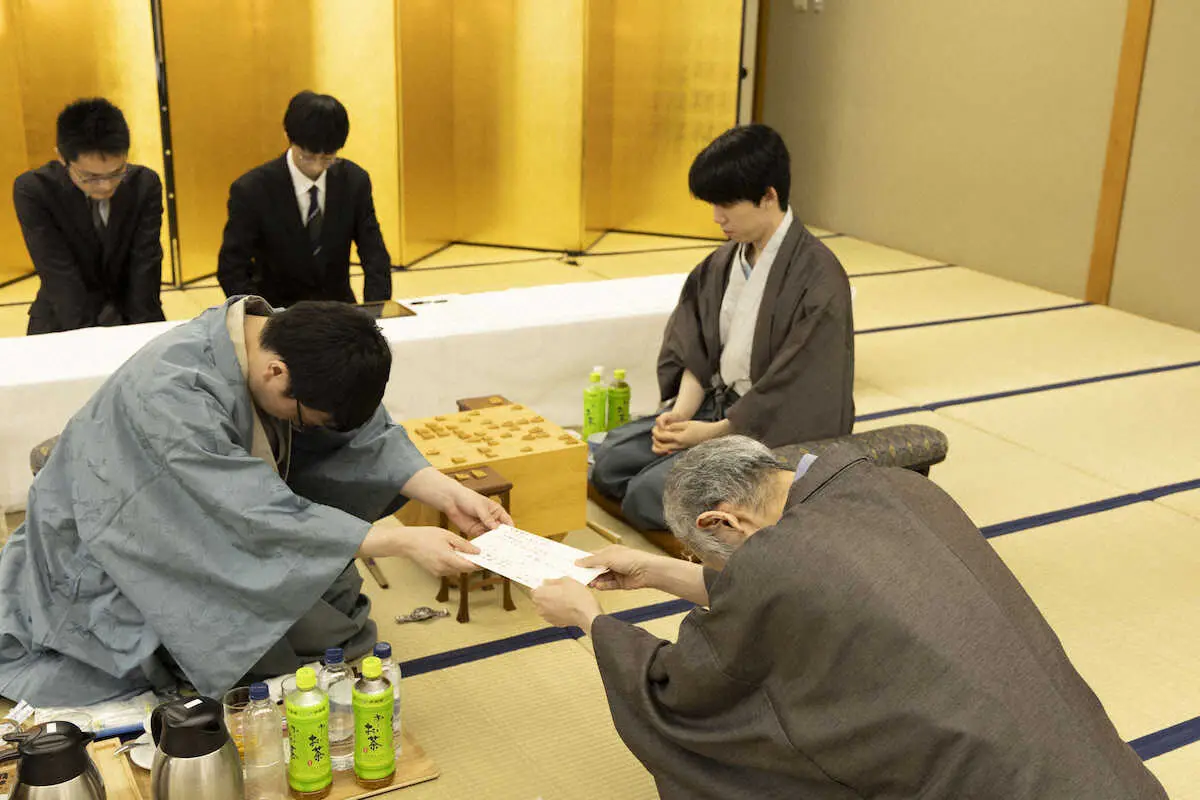 藤井聡太王位(右奥)が見守る中、立会人の中田功八段(右手前)へ封じ手を手渡す永瀬拓矢九段(日本将棋連盟提供)