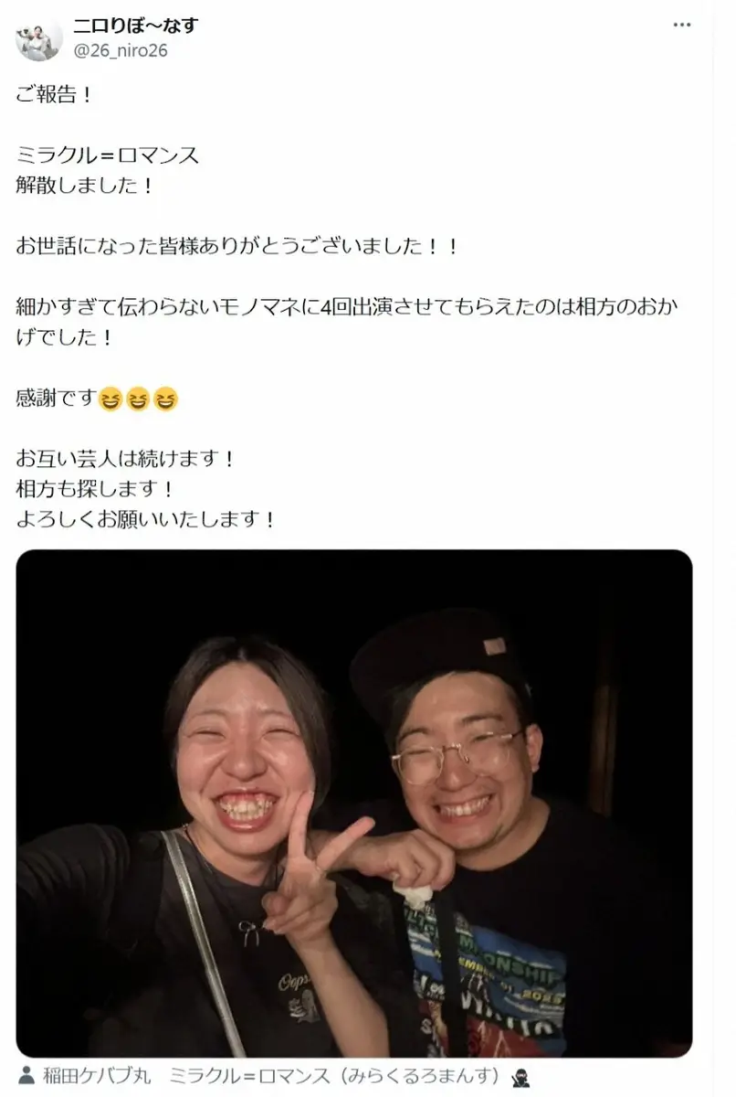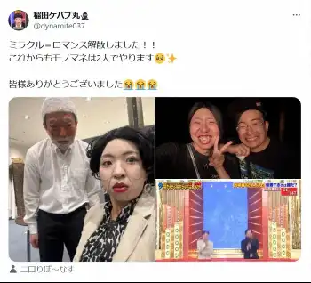 「ミラクル=ロマンス」稲田ケバブ丸のX(@dynamite037)から 吉本興業所属の男女コンビが解散 「細かすぎて…」4回出演、今後も芸人と… ギャラリーで見る この記事のフォト 2025年08月20日の画像一覧 もっと見る 2025年08月20日の画像をもっと見る