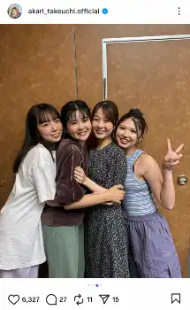 竹内は「魔法少女アイドルめいめい 改めてありがとうございました!!」と書き出し、自身がゲスト出演し、かつてハロー!プロジェクトのグループ「スマイレージ」と「アンジュルム」でともに活動した同期で俳優の田村芽実が主催したイベントで撮影されたオフショットを披露。