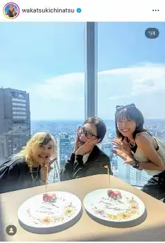景色の良いレストランで、メッセージプレートを前に笑顔でポーズ。「野沢さん再婚祝い、KABA.子誕生日祝いやっとできた!!」とそれぞれの節目を祝ったことを報告し、「よく“このメンバーで何を話すの?”って聞かれますが今日はビデの正しい使い方について話しましたよ~」とユーモアたっぷりに会話の内容を明かした。