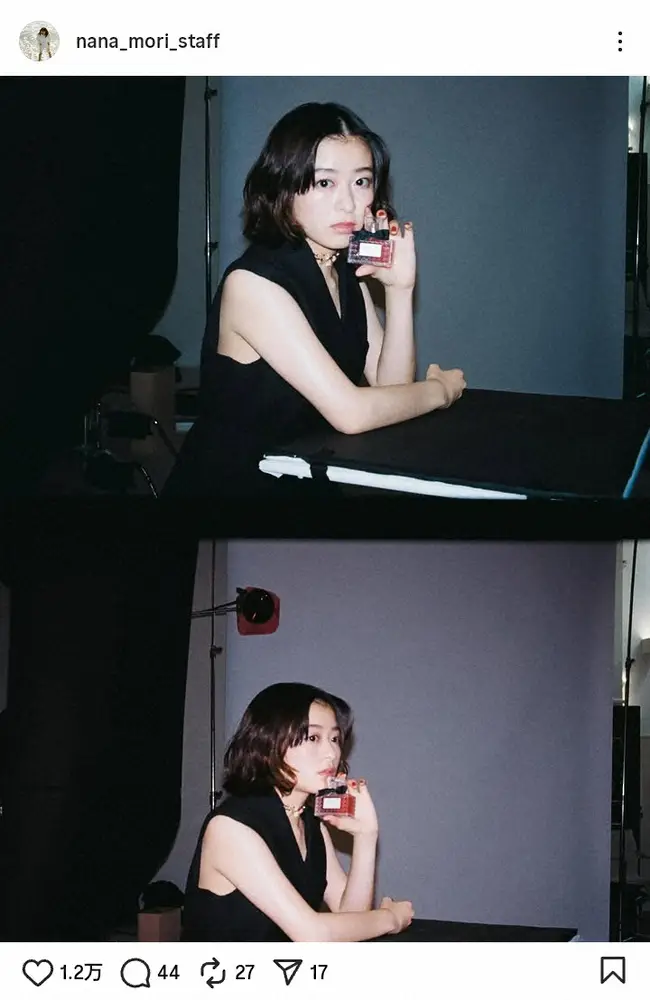 同アカウントでは「フィガロジャポン10月号 オフショット」と、前日に告知された雑誌撮影のオフショットを公開。黒いノースリーブ姿で香水を手にした森が、こちらに目線を送っている。