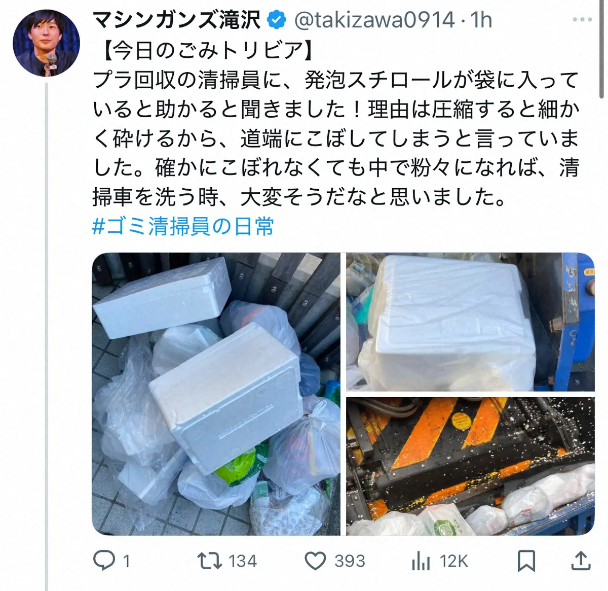 滝沢は「【今日のごみトリビア】」とし「プラ回収の清掃員に、発泡スチロールが袋に入っていると助かると聞きました!」と投稿。