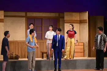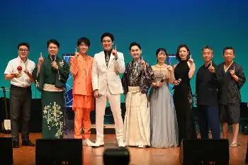 <1PPO~歌と芝居の贈り物~>開演前の囲み取材に応じる(左から)けん玉ちばちゃん、三山ひろし、辰巳ゆうと、木村徹二、彩青、津吹みゆ、藤井香愛、大森博氏、山口良一(撮影・井利 萌弥)