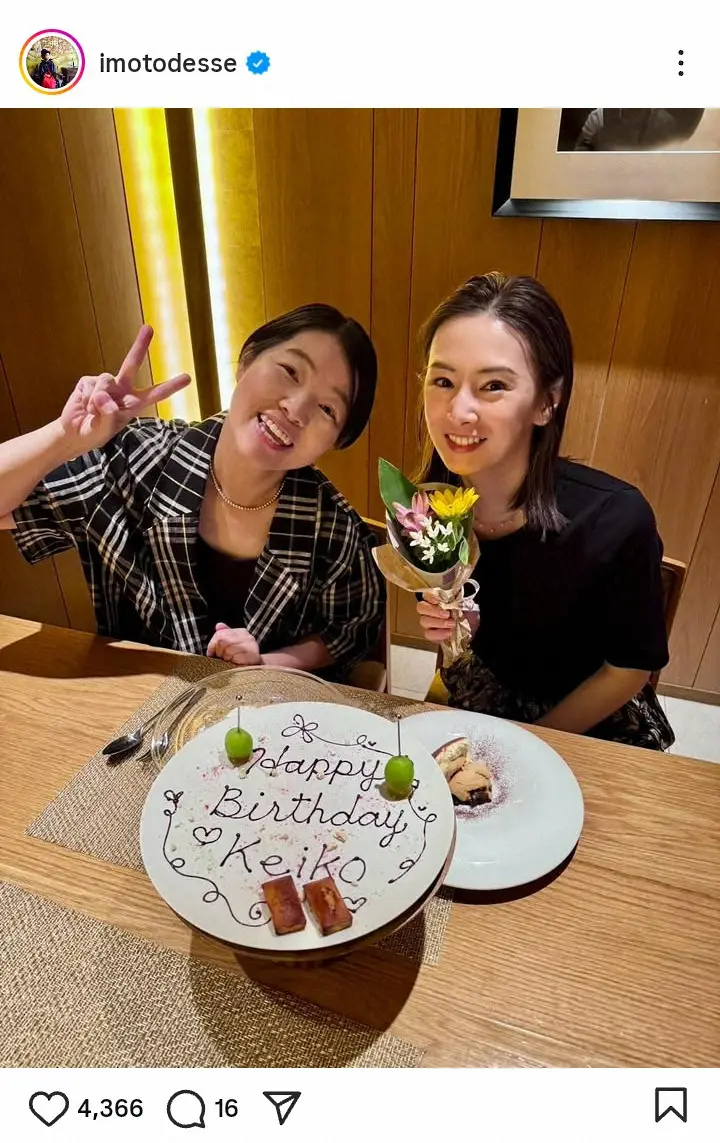 「景子ちゃん #happybirthday」と書き出すと、飲食店でバースデープレートを前に花を持ち笑顔の北川と、ピースサインで祝福する自身の2ショットをアップ。