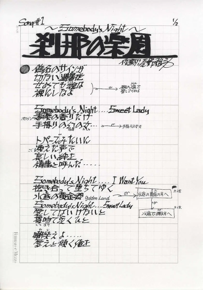 手書きの原稿を見るまで忘れていたのですが、僕は「刹那の楽園」というタイトルで歌詞を考えようとしていたようです。原稿にはサブタイトルとして「SOMEBODY’S NIGHT」と書いてあります。曲の世界観を明確に伝えるフレーズなので、こちらに決めて良かったなぁって思います。