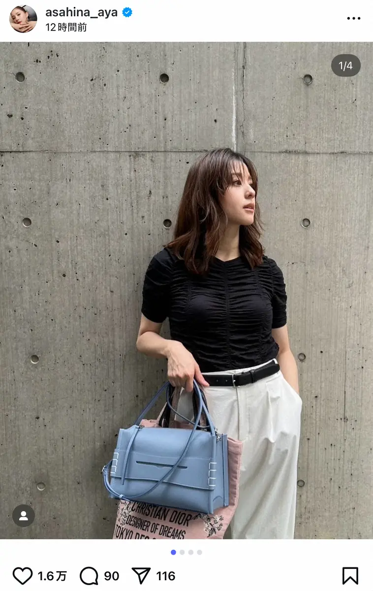 朝比奈は「とある日の私服」とし、黒のトップスに白のパンツ、ブルーのハンドバッグとピンクのトートバッグを手にしたシンプルなコーデを披露した。