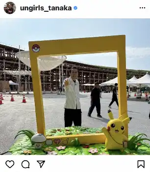 大阪・関西万博の夢洲会場の大屋根リング付近に設置されているポケットモンスターのフォトフレームにおさまった田中。右腕を前に出し、険しい表情でポケモンカード風のポーズをとった。