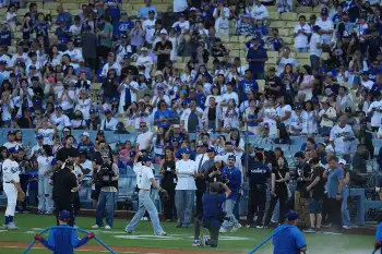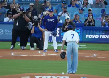 BTSのメンバー数にちなみ、背番号「7」のドジャースホームユニホームに袖を通したVは、ベンチで大谷と笑顔で握手を交わし、ハグ。その後、記念撮影を行った。世界的人気を誇るスター同士の共演に多くの報道陣が殺到し、カメラが向けられた。