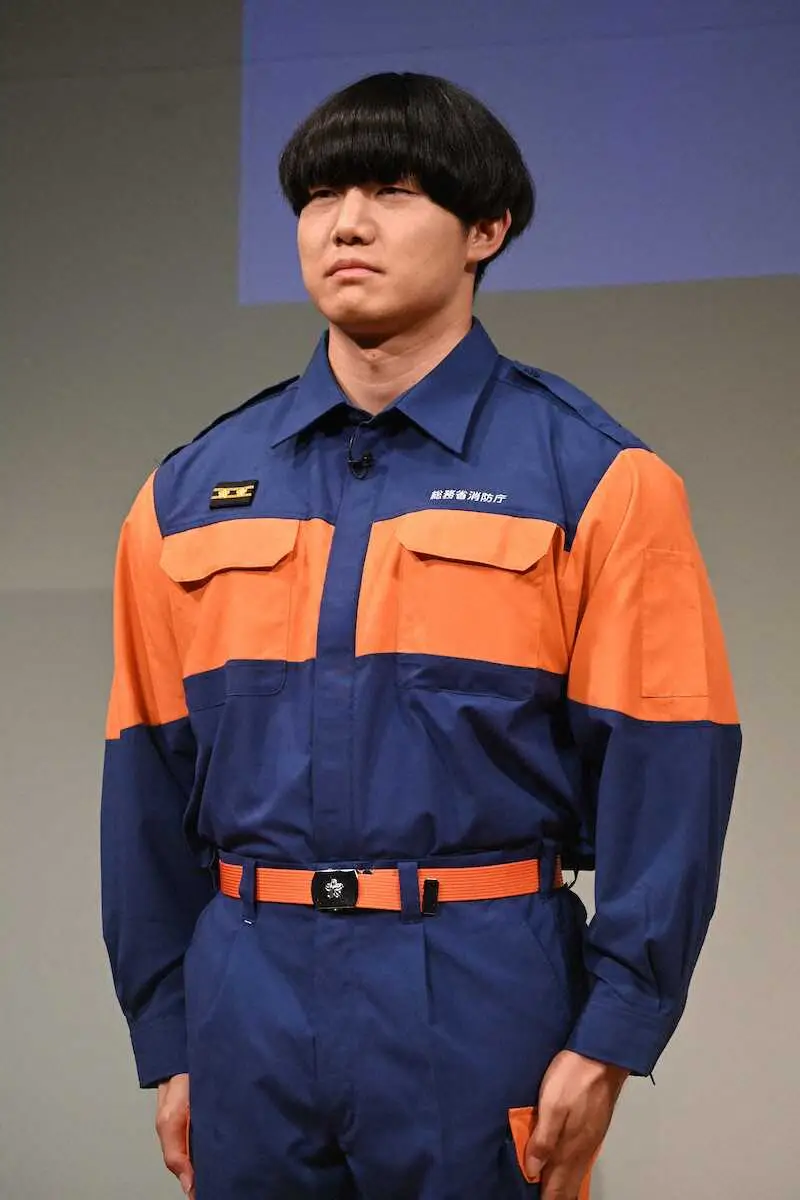 元消防士の青木。消防団の活動服を着て登場し、深々と一礼した。