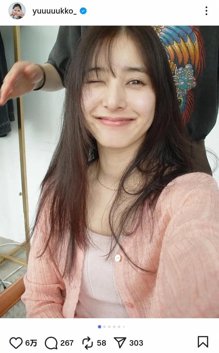 新木は「SNIDEL HOME新しいLOOKが公開されました!! ぜひチェックしてください」とつづり、ピンクのカーディガンに髪を無造作に下ろしてウインクで写る“自然体オフショット”を披露。