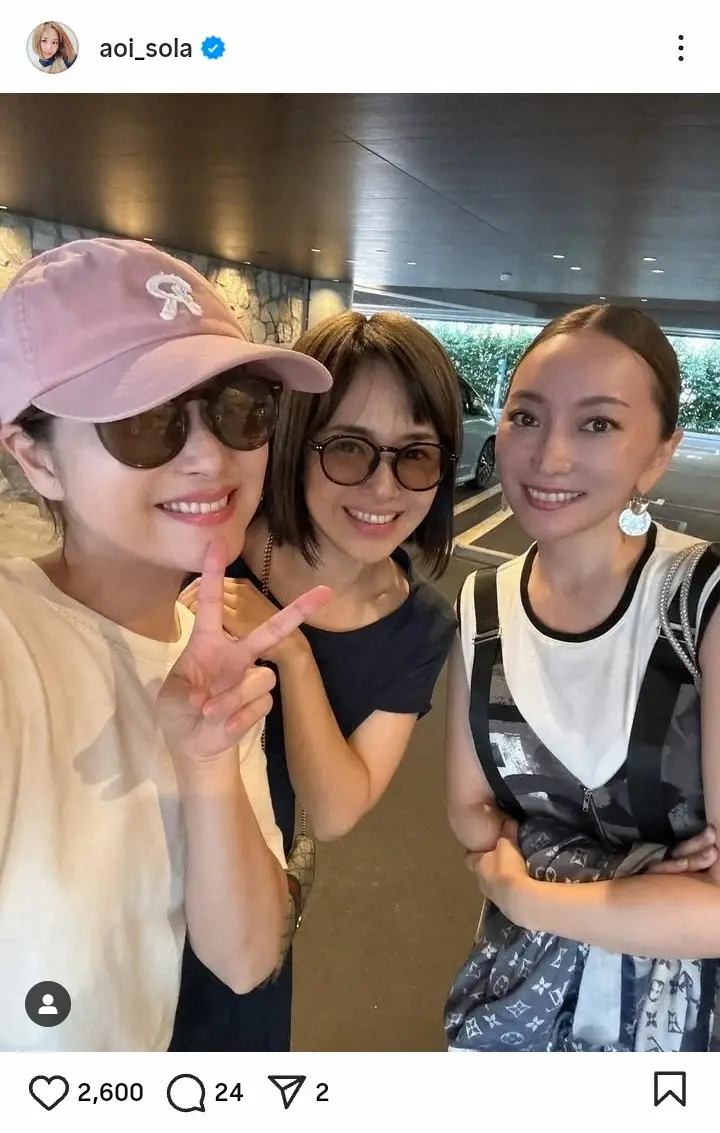 タレント・蒼井そらが28日までに自身のインスタグラムを更新。タレントの鈴木奈々(37)、加藤綾菜(37)との3ショットを披露した。