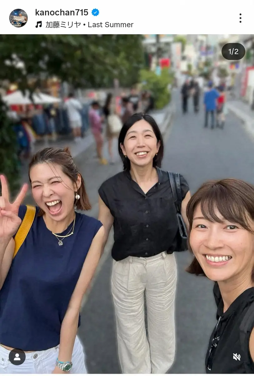 狩野さんは「仕事前の集合 平均身長185.5でした笑」と投稿し、元代表メンバーの木村沙織さん、荒木絵里香さんと街中を歩く自然体な自撮りショットを披露。