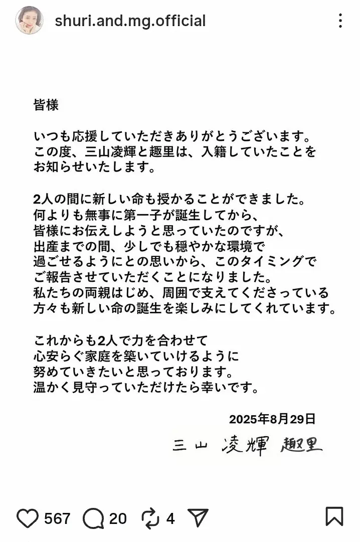 女優の趣里(34)が男性7人組「BE:FIRST」のRYOKIこと三山凌輝(26)と結婚したことが28日、分かった。きょう29日に正式発表される。スポニチ本紙の取材では婚姻届を既に提出している。趣里は現在妊娠しており、関係者によると安定期に入っているという。