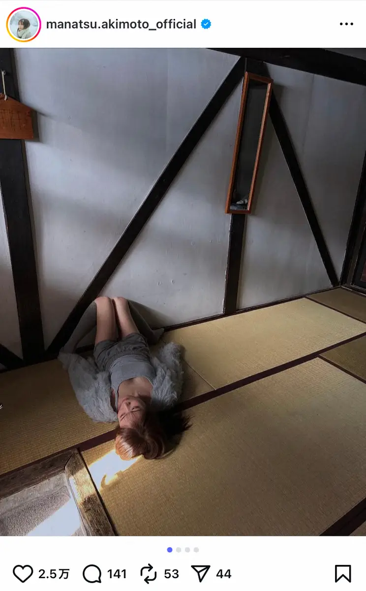 今月23日にグループ卒業後、個人として初のフォトブック「淡淡(あわあわ)」(幻冬舎)を発売した秋元。この日は「オフショット 畳落ち着く~」と書き出し、畳に寝そべる姿を披露した。