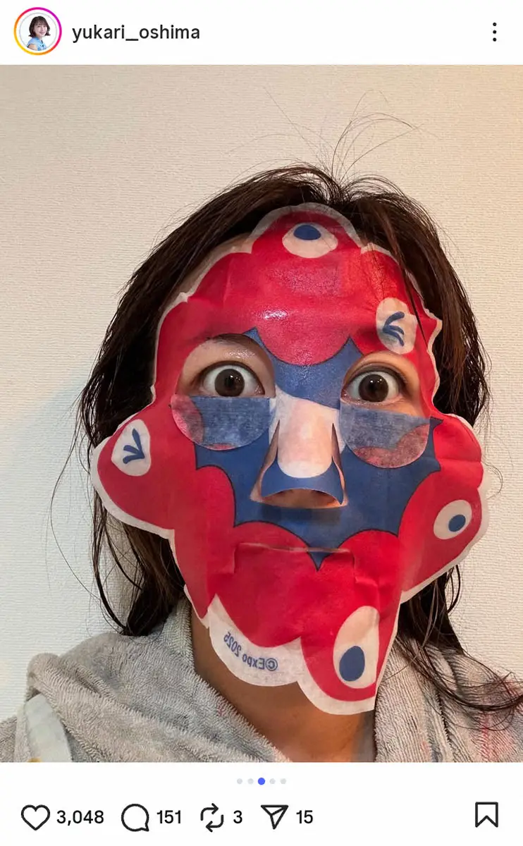 「なんでこの形をフェイスパックにしようと思ったのか……」と書き出した大島アナ。大阪・関西万博の公式キャラクター・ミャクミャクのフェイスパックを付けた写真を公開した。