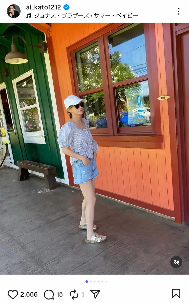 加藤はストライプのシャツにデニムショーパン、白キャップのカジュアルコーデで美脚を披露。ハッシュタグで「コスメ好き」「ショートパンツは旅先限定」と付け加えた。
