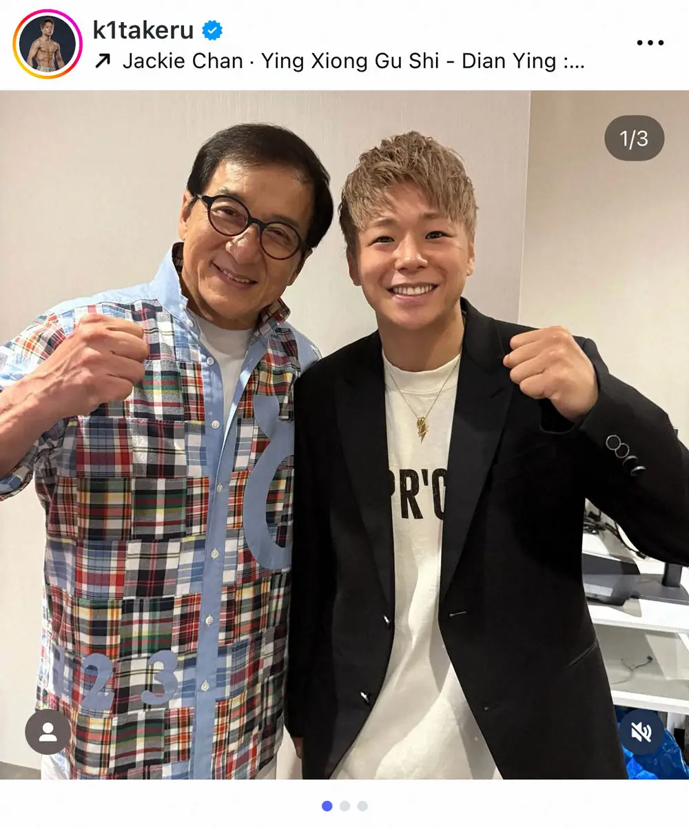 武尊は「子供の頃から大好きだったジャッキー・チェンさんとお会いさせて頂きました」と香港の俳優のジャッキー・チェンと笑顔の2ショットを披露した。