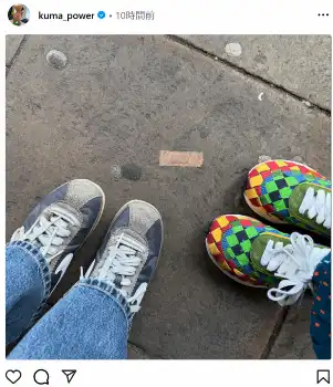 「10才になった息子に足のサイズ追いつかれて、前々から履きたいと言われてた私のかわいいSacaiの靴を共有し始めた」と靴を共有し始めたことを報告。スニーカーを履いた足のツーショットを公開し、「もうどっちがどっちか分からない」とつづった。
